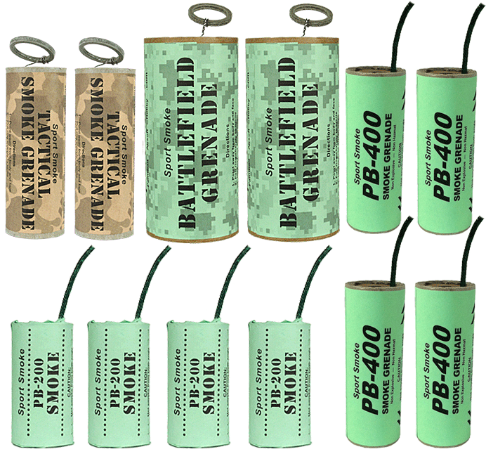 The Value Pack includes 2 of our Tactical Smoke Grenades, 2 BattleField Smoke Grenades, 4 PB-200 Smoke Grenades, and 4 PB-400 Smoke Grenades. For the player who wants a good mix of both pull ring and fuse lit smoke grenades, the Value Pack is the perfect choice.